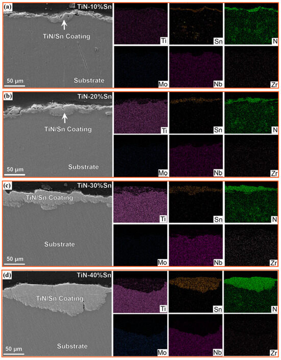 The SEM morphology and energy spectrum of the coating cross-section are shown in Figure 5. The interfaces of the TiN/Sn coatings with different powder proportions generally exhibit a winding and tortuous feature. The phenomena of impact and extrusion into the substrate surface layer are visible in some areas [4]. No pores or looseness are observed on the coating or its interface. This is because the substrate is relatively soft, and the repeated collisions between the grinding balls and the substrate cause plastic deformation on the alloy surface layer in the initial stage of ball-milling [10]. The hard TiN particles are directly squeezed into the titanium substrate under the impact of the grinding balls, forming a surface-particle-strengthened layer. With the increase in the ball-milling time, the activity of the powder increases, and cold-welding occurs between the powder and the substrate. Under the action of the grinding balls, the powder gradually deposits and densifies, ultimately forming a TiN/Sn coating of a certain thickness. The mapping analysis showed the continuous increase in the coating thickness as the amount of SN increased, which is consistent with the results in Figure 4. Under the field of view of the optical microscope, the thickness ranges and average thicknesses of the coatings for samples with 10%, 20%, 30%, and 40% Sn are 5.45–13.34 μm, 5.40–16.84 μm, 9.78–28.90 μm, 10.86–32.38 μm and 8.08 μm, 14.05 μm, 18.33 μm, and 23.55 μm, respectively. As a plastic material, Sn increases the overall adhesion of the powder, raising the probability of cold-welding during the impact of the grinding balls. Meanwhile, the particle radius of Sn powder is significantly smaller than that of TiN powder, endowing it with a stronger packing ability [23]. Therefore, the increase in the amount of Sn promotes the increase in the coating thickness.