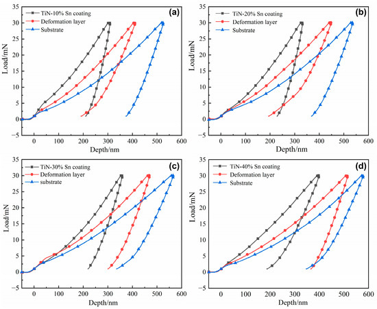 Nanoindentation tests were carried out on the cross-section of the Ti-25Nb-3Zr-Sn-3Mo samples. The test positions were selected as the surface coating area, the subsurface mechanical deformation layer area, and the substrate (at a position more than 200 μm away from the surface layer). The load was increased from 0 to 30 mN. The obtained load–displacement curves are shown in Figure 6, and the maximum indentation depth Hmax, nano-hardness H, and elastic modulus E are listed in Table 1. The Hmax gradually increased from the surface to the interior after SMCS. For the same region of different samples, Hmax increased with the increase in the proportion of Sn powder. It can be seen that the TiN/Sn particle-strengthened coating improves the hardness of the surface layer of the titanium alloy, and with the increase in the proportion of Sn powder, the coating plasticity is improved, and hardness is reduced. The Hmax of the subsurface mechanical deformation layer exhibits the same regularity. The cushioning effect provided by the thicker coating reduces the degree of deformation of the substrate, thus reducing the work-hardening effect. The values of H and E calculated from the indentation depth are listed in Table 1. It can be seen that the H and E values of the 10% Sn coating are 9.50 GPa and 221.20 GPa, respectively, which are 2.98 times and 2.28 times higher than those of the substrate. Research shows that the higher the H/E value of a material, the better its wear resistance; the higher the H3/E2 value, the better the material’s ability to resist plastic deformation [20,24]. When the proportion of Sn powder is relatively low (10% Sn, 20% Sn), the values of H/E and H3/E2 are highest in the mechanical deformation layer, followed by those in the coating area, and when the proportion of Sn powder is relatively high (30% Sn, 40% Sn), the values of H/E and H3/E2 are highest in the coating area. This indicates that the composite-strengthened layer has good load-bearing capacity and plastic deformation resistance [25].