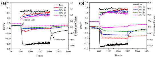 Under different loading conditions, the COF of all samples was higher than that under the corresponding OCP conditions (as shown in Figure 7). The main reason for this could be that the wear debris cannot be dissolved under cathodic protection, resulting in a relatively high roughness in the wear scar area. The COF of the coating samples was lower than that of the raw samples and decreased with the increase in the Sn content, further confirming the lubricating effect of Sn [23]. The gradually increasing wear debris adhered to the wear scar area during the friction process, increasing the frictional resistance and leading to an increase in the COF [4].