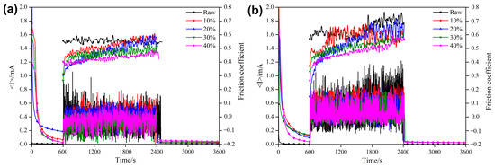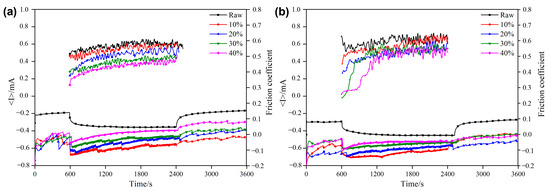 The changes in the COF and current of the raw sample and the composite coating sample during the wear–corrosion test under the applied potentials of −1.5 V and +0.5 V are shown in Figure 8 and Figure 9, respectively.