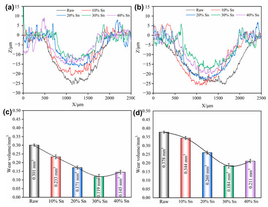 The wear scar profile and wear volumes of the raw samples and composite-strengthened samples after the tribocorrosion test under OCP are shown in Figure 10 and Figure A1. A large number of parallel grooves appear along the sliding direction on the raw sample, and the width and depth of the wear scar increase from 1565 μm and 23.86 μm under the 2 N load to 2256 μm and 25.41 μm under the 4 N load, respectively. The degree of wear of the coating samples first decreases and then increases with the increase in the Sn content; among them, the sample with 30% Sn powder has the smallest wear scar width (1093 μm under the 2 N load and 1319 μm under the 4 N load) and the shallowest depth (13.26 μm under the 2 N load and 18.89 μm under the 4 N load). The wear volume loss of the coating samples is reduced compared to that of the raw samples, indicating that the wear resistance of the alloy can be improved through SMCS. The formation of the composite-strengthened layer enhances the alloy’s hardness and its resistance to plastic deformation, and it can effectively reduce the material volume loss caused by pure mechanical wear [33].