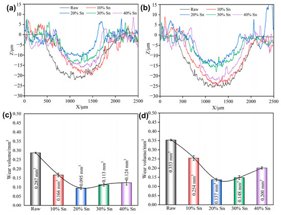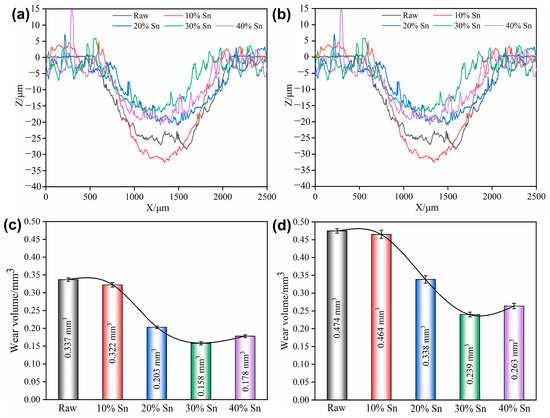 The wear scar profile and wear volumes of the raw samples and composite-strengthened samples after the tribocorrosion test with applied cathodic potential (E = −1.5 V) are shown in Figure 11 and Figure A2. Compared with the OCP, the width and depth of the wear scars of the raw samples and the composite-strengthened samples decrease under cathodic protection. This is because only the wear effect, and not the corrosion effect, exists under cathodic protection [34]. The wear volume loss of the samples before and after SMCS under different loads increases overall with the increase in the load. The coating samples under cathodic protection exhibit the same regularity as under OCP; that is, the wear volume loss first decreases and then increases with the increase in the Sn content. The difference is that the coating sample with 20% Sn content has the least material loss under cathodic protection. On the one hand, this is because the coating with 20% Sn has a higher hardness and better wear resistance. Under cathodic protection, since only the wear effect exists, a harder coating is better able to resist plastic deformation. On the other hand, it also indicates that the coating with 20% Sn has poor corrosion resistance, and the corrosion has a stronger promoting effect on wear.