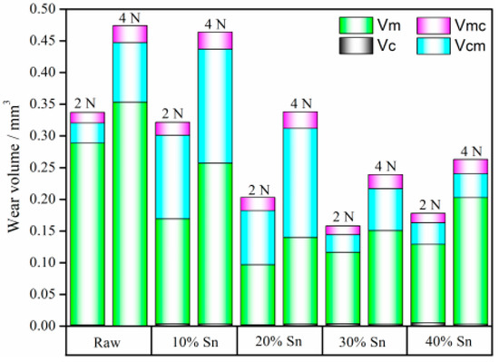 - Under different loads and electrochemical conditions, the wear volume loss of the composite-strengthened layer is lower than that of the raw sample, and the wear volume loss first decreases and then increases with the increase in the Sn content. Under cathodic protection, the 20% Sn sample has the lowest wear volume loss under both 2 N and 4 N loads. Under OCP and anodic corrosion, the 30% Sn sample exhibits the minimum wear volume loss.