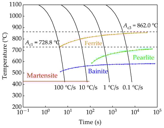 Simulated CCT diagram for the tested S355 steel using the JmatPro software program.