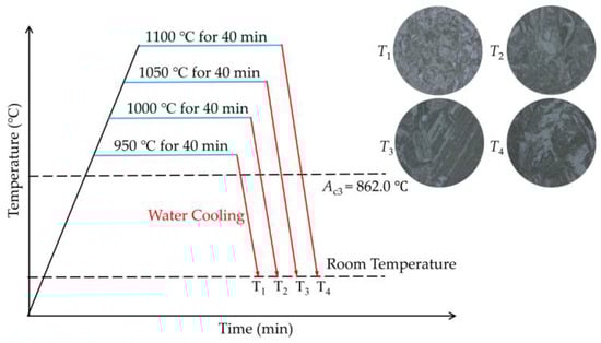 Before heat treatment, a thermodynamic analysis of the material was conducted. Figure 2 shows the CCT diagram of the tested S355 calculated by the JMatPro 7.0 software program. As shown in Figure 2, the start and end temperatures of austenite transformation (Ac1 and Ac3) for S355 steel are 728.8 °C and 862.0 °C, respectively. Typically, full austenitization can be achieved above the Ac3. When the austenitization temperature exceeds 1200 °C, the austenite grains will significantly coarsen, potentially leading to overheating, which negatively impacts the material’s performance. The austenitization temperatures for the test steels were set below 1200 °C to study the microstructure variation and its effect on the hydrogen diffusion behavior and HIC sensitivity of the heat-treated materials. The heat treatment process is shown in Figure 3. Samples measuring 60 mm × 20 mm × 15 mm were cut from the S355 steel plate. These samples were austenitizated in the heat treatment furnace at four temperatures for 40 min, which were designated as T1 (950 °C), T2 (1000 °C), T3 (1050 °C), and T4 (1100 °C), respectively. Then, the four samples were quenched in water with the ambient temperature of 20 °C to achieve hard microstructures consisting mainly of martensite.
