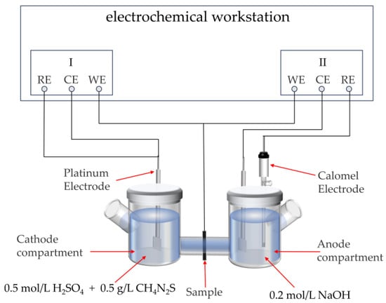 Two-cycle HP tests for each group of water-quenched samples were carried out according to the ASTM G148 standard. In each group of hydrogen permeation tests, three samples were prepared, and each sample was subjected to the hydrogen permeation test twice. Samples measuring 18 mm × 12 mm × 1 mm were cut from heat-treated steels using wire cutting. The samples were ground and polished on both sides using SiC papers and diamond polishing paste. Nickel plating on one side was performed using a CS2350 electrochemical workstation (Wuhan Corrtest, Wuhan, China) with a current density of 4 mA/cm2 for 360 s to achieve a nickel coating thickness close to 0.2 μm. The permeation tests were carried out at room temperature, which was approximately 20 °C. As shown in Figure 5, the HP tests were conducted employing a CS2350 electrochemical workstation and a Devanathan–Stachurski double electrochemical cell setup [22]. The anode compartment contains a 0.2 mol/L NaOH solution. When hydrogen atoms reach the anode surface, they are oxidized to H+, which immediately combine with OH⁻ to form water (H+ + OH− → H2O). An anodic potential of +300 mV was applied to ensure the complete ionization of diffusible atomic hydrogen in the samples. The test results were considered unaffected by residual diffusible hydrogen when the background current stabilized below 1 × 10⁻⁶ A. After the background current was eliminated, the hydrogen was charged, and the real-time hydrogen charging current density–time curve of the anode was observed. When the power supply was turned off after reaching the steady state for a period of time, the anode current began to decay. When it dropped to 2 × 10−7 A, the first cycle test was completed. Then, the above operation and completed the test of the second cycle was repeated. After completing the tests, four parameters can be calculated based on Fick’s law: HP flux (J∞), hydrogen effective diffusion coefficient (Deff), hydrogen concentration (C0), and hydrogen trap density (NT) [23,24].