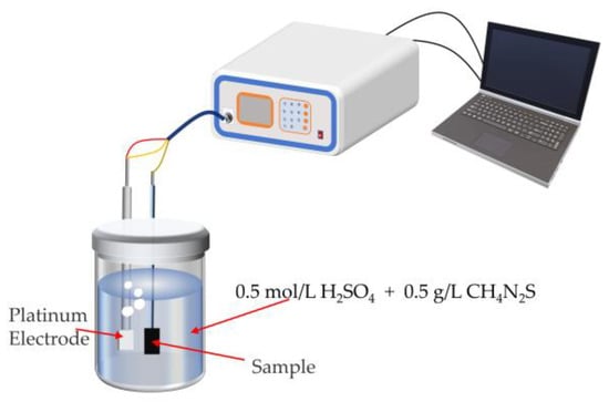 Metal slices of 18 mm × 13 mm × 2 mm were cut from the water-quenched samples and polished on both sides. The hydrogen was charged using a CS1002 galvanostat. The test setup is shown in Figure 6. The auxiliary electrode is connected to a platinum electrode, while the working electrode is connected to the sample. Electrochemical hydrogen charging was conducted with a current density of 100 mA·cm2 for 3 h to induce cracking. The hydrogen charging time was determined based on previous experience and results of preliminary tentative experiments. In each group of the hydrogen-charged cracking test, three specimens were selected for measurement. After hydrogen charging was completed, the samples were then rinsed with anhydrous ethanol and etched using a 4% nital solution for 5 to 10 s. Crack propagation observation of the hydrogen-charged surface was conducted using a Quanta 250FEG SEM.