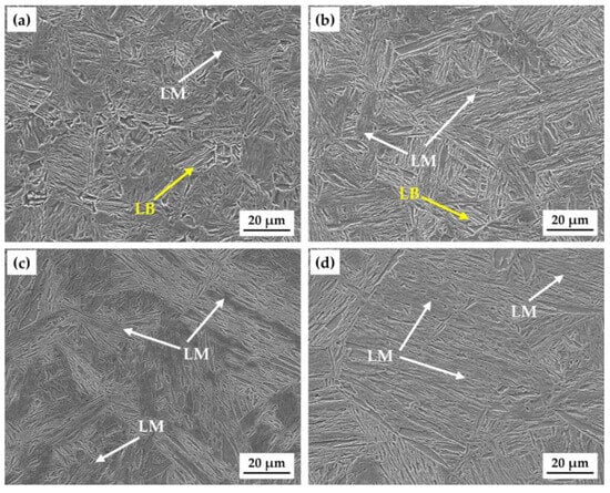 Martensite is a supersaturated solid solution of carbon trapped in a body-centered tetragonal structure, and it is considered metastable. The term “martensite” was named after the German scientist Adolf Martens, who first used it to describe the hard microscopic phase found in quenched steels [26]. Lath martensite (LM), typically formed during the quenching process of C-Mn-Si high-strength steels, consists of parallel arrays or stacks of plate-like or lath-shaped crystals [27]. According to the ISIJ Bainite Committee classification, several microstructures are identified in low-carbon microalloyed steels, including two types of bainitic microstructures: granular ferrite and bainitic ferrite, often referred to as granular bainite and lath-like bainite (LB), respectively [28]. The LB defined by the ISIJ Bainite Committee classification consists of highly dislocated ferrite laths separated by low-angle boundaries, with M/A constituents interspersed between them. The microstructures of the test steels quenched at four different temperatures are shown in Figure 7. The test steel quenched at 950 °C primarily consisted of LM with a small amount LB. The amount of LB decreased while the content of LM increased as the Twq increased to 1000 °C. When the Twq was further raised to 1050 °C, the test steel consisted entirely of LM. For the steel quenched at 1100 °C, the prior austenite grains and lath bundles of LM became coarser, although the microstructure was still composed of martensite. As the holding temperature increases, the austenite grains grow larger and their stability improves. Consequently, the phase transformation during the cooling stage shifts toward lower temperatures, suppressing the bainite transformation and reducing the amount of LB.