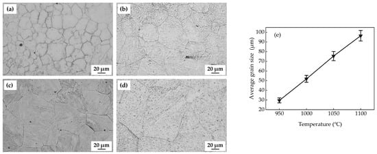 Grain structures and average grain size of the test steels at different Twq levels: (a) 950 °C, (b) 1000 °C, (c) 1050 °C, (d) 1100 °C; (e) average grain size.