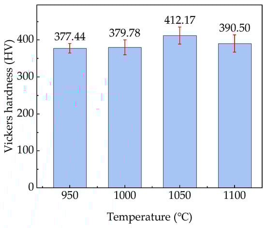 Figure 9 shows the hardness test results of the test steels quenched at different temperatures. The hardness of the test steel increased with the Twq and reached its maximum with a Twq of 1050 °C, and then decreased slightly with the Twq. The hardnesses of the steels quenched at 950 °C and 1000 °C exhibited little variation with the values of 377.44 HV and 379.78 HV, respectively, with a 0.62% increase from 950 °C to 1000 °C. When Twq increased to 1050 °C, the hardness increased to 412.17 HV with an increment of 34.73 HV compared to that of 950 °C-quenched steel, representing a 9.20% increase. However, the hardness decreased to 390.50 HV as Twq increased to 1100 °C, a 5.26% decrease from the value at 1050 °C. At the Twq levels of 950 °C and 1000 °C, LB existed in the test steel. The hardnesses of the test steel at these two temperatures were relatively low because the hardness of LB was lower than that of LM. As the Twq increased to 1050 °C, the test steel was mainly composed of LM. Since the hardness of LM was relatively high, the hardness of the test steel reached a higher level. However, although the test steel was also mainly composed of LM when Twq increased to 1100 °C, as shown in Figure 8, the average grain size of the test steel at 1100 °C was 96.52 μm, which was larger than 75.43 μm at 1050 °C. The 1050 °C-quenched steel exhibited a higher hardness than that of 1100 °C-quenched steel, owing to its higher dislocation density with smaller grains.
