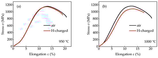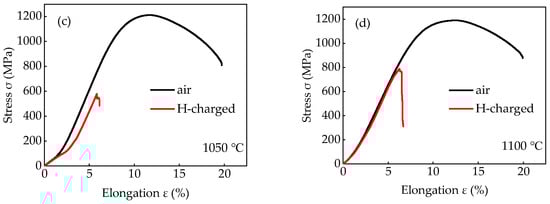 Figure 10 illustrates the stress–strain curves of the test steels with different Twq levels. At the Twq of 950 °C, hydrogen pre-charging induced a slight difference in the stress–strain curves between the hydrogen pre-charged tensile sample and the air-tensiled sample. At the Twq levels of 1000 °C, 1050 °C, and 1100 °C, the reduction in tensile strengths with hydrogen pre-charging was more pronounced compared to that of the 950 °C-quenched tensiled samples. For the air-tensiled samples without hydrogen pre-charging, the tensile strengths of the test steels increased initially and then decreased, reaching values of 1163 MPa, 1171 MPa, 1213 MPa, and 1190 MPa, respectively. The peak value of 1213 MPa was reached at the Twq of 1050 °C. However, with hydrogen pre-charging, the tensile strengths of the test steels decreased to 1150 MPa, 1089 MPa, 579 MPa, and 786 MPa, respectively. The tensile strengths of the steels were deteriorated to some extent with a minimum value of 579 MPa for Twq of 1050 °C. With hydrogen pre-charging, the elongation rates were 19.1%, 17.5%, 6.1%, and 6.7%, respectively.