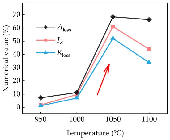 Figure 11 shows the tensile strength loss Rmloss, the elongation loss Aloss, and the Iz of the test steels after hydrogen charging. The red arrow indicates the direction towards the major probability of HIC susceptibility. At the Twq of 950 °C, the Rmloss and Aloss of the test steel were 1.12% and 7.26%, respectively, with the Iz of 1.82%. As Twq increased to 1000 °C, the Rmloss and Aloss of the test steel were 7.00% and 11.24%, respectively, with the Iz of 9.55%. For the Twq of 1050 °C, the Rmloss, Aloss, and Iz of the test steel reached their maximum values of 52.27%, 68.62%, and 61.06%, respectively. When the Twq increased to 1100 °C, the Rmloss, Aloss, and Iz of the test steel decreased slightly compared to that of 1050 °C, with values of 33.95%, 66.47%, and 55.02%, respectively. As the Twq increased, the Rmloss, Aloss, and Iz of the test steels followed a similar varying regularity of first increasing and then decreasing. For the Twq levels of 1050 °C and 1100 °C, the Iz values exceed the critical value of 35% defined by the evaluation standard [29], indicating a significant HIC susceptibility.
