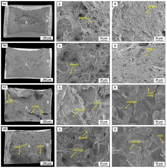 Figure 12a–d shows the fracture surfaces of water-quenched SSRT samples with hydrogen charging. As shown in Figure 12a,b, in the Twq range of 950 °C to 1050 °C, the fracture morphology exhibited less necking as the Twq increased. At the Twq levels of 1050 °C and 1100 °C, the fracture morphologies exhibited typical brittle fracture morphology with almost no necking characteristics. Since hydrogen diffusion occurs at the surface layers of the alloy, fractography should also focus on the outer layers, so we carried out magnified observations of the B region, which is close to the fracture surface and can reflect the outer layers’ situation to some extent. High magnification fracture morphologies of central zone A and edge zone B were analyzed and are shown in Figure 12a,b. Dimples were identified both in the central and edge zones of the fracture surfaces for samples quenched at 950 °C and 1000 °C, while cleavage cracks were observed in the edge and the central zones of the fracture surfaces for samples quenched at 1050 °C and 1100 °C. At the Twq of 1050 °C, the overall fracture surface exhibited prominent brittle fracture features of cleavage steps and river pattern, with approximately no visible dimples. As the Twq was raised from 1050 °C to 1100 °C, shallow dimple features were redetected in the central zone of the fracture surface, with cleavage cracks still in the edge zone indicating a mainly brittle fracture. Compared to the samples quenched at 950 °C and 1000 °C, the number and size of the dimples in 1100 °C-quenched sample reduced, while the number of microcracks relatively increased.