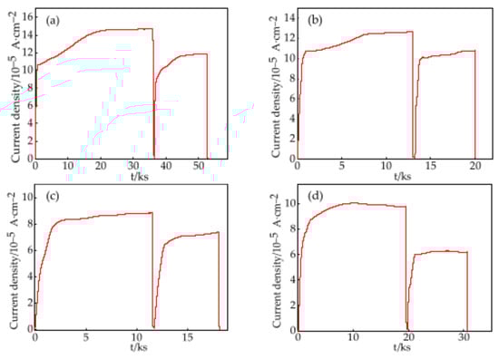 Hydrogen permeation curves of the test steels at different Twq levels: (a) 950 °C, (b) 1000 °C, (c) 1050 °C, (d) 1100 °C.