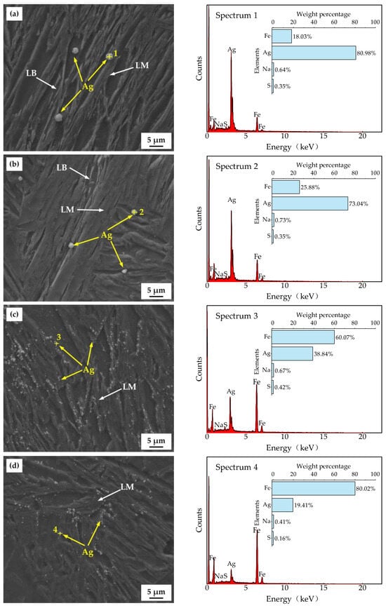 Figure 14 shows the corresponding EDS results of the water-quenched samples after the HMT tests. The test uses the reaction between hydrogen and AgBr (AgBr + H → Ag + HBr) to replace hydrogen in the metal and visualize hydrogen escape sites as silver particles. This reaction exhibits selectivity towards hydrogen escape sites. Furthermore, silver particles are easy to identify under microscopy due to their distinct contrast and morphology, which is ideal for visualization. The white particles can be confirmed as silver particles based on the EDS analysis results. The images revealed that white silver particles were mainly distributed along the martensitic lath interfaces, indicating a large number of hydrogen traps at these locations.