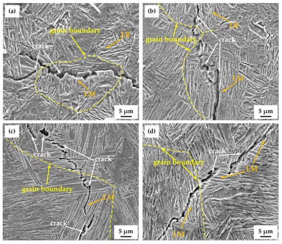 Figure 15 shows the images of cracks in the four water-quenched samples after hydrogen charging. It is observed from Figure 15a,b that no cracks are observed in the bainitic structures. The cracks were located at the martensitic lath interfaces, indicating a greater HIC susceptibility of martensite than that of bainite. This is consistent with the findings of Jo [32]. It was reported that martensite lath interfaces had relatively high binding energies around 60 kJ/mol and could be classified as irreversible hydrogen traps [33]. Research has shown that austenite grain boundaries [34] and martensite lath structures [35] provide trapping sites for hydrogen atoms, which have a significant impact on HIC. It can also be seen from Figure 15 that the cracks in the four water-quenched samples were essentially transgranular cracks, and there was hardly any intergranular cracking identified. Thus, it can be concluded that martensitic lath interfaces were preferential sites for hydrogen trapping and crack propagation in the water-quenched samples studied in the present work.