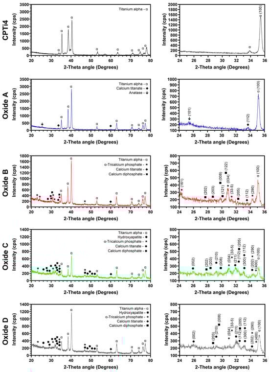 Representative X-ray diffraction scans of the CPTi4 substrate material and each oxide. Full ranges of 20° to 80° two-theta scans are shown on the left side. A zoomed-in 24° to 36° two-theta angle region is shown to the right side to emphasize the formation of crystalline calcium oxide phases. The anatase phase was formed in oxide A. Calcium titanate and calcium diphosphate phases were formed in all the oxides. Oxides C and D showed a combination of α-tricalcium phosphate and hydroxyapatite phases, with oxide D having predominantly hydroxyapatite.