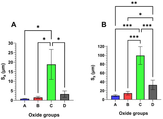 Representative 3D optical profilometer oxide surface roughness values. Oxide C was found to have significantly higher (A) oxide average surface roughness (Sa) values (p < 0.05) and (B) oxide peak-to-valley roughness (Sz) values (p < 0.001) compared to the other oxides. Oxide D also had significantly higher Sz values compared to oxide A (p < 0.01) and oxide B (p < 0.05). The * symbol denotes a statistical significance of p < 0.05. the ** symbols denote a statistical significance of p < 0.01, and the *** symbols denote a statistical significance of p < 0.001.