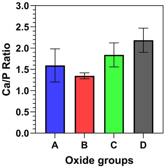 The EDS surface compositions for each oxide group are compiled in Table 2. The corresponding oxide average Ca/P ratios are provided in Figure 4. Each oxide group showed the presence of titanium (Ti) and oxygen (O), with the amount of Ti decreasing in transitioning from oxide A through D. For Oxide A, 4% Ca and 3% P and some Mg (<1%) dopants were incorporated. Oxide B showed substantially higher dopant uptake, with approximately 13% Ca, 9% P, and <1% Mg. Oxides C and D exhibited similar dopant uptake levels of at least 10% Ca, 5% P, and <1% Mg. The surface EDS-derived Ca/P ratios were also shown to generally increase with the transitions from oxide A to oxide D.