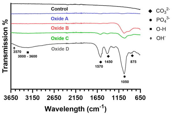 FTIR analyses on oxide A in the present study revealed some poorly defined absorption peaks. In contrast, oxide B revealed small absorption peaks for PO43− (1050 cm−1) in agreement with the α-tricalcium phosphate formation shown in Figure 1 in addition to some poorly defined CO32− (1450 and 1570 cm−1) peaks. Oxides C and D showed characteristic absorption peaks for PO43− (1050 cm−1) and CO32− (875, 1450, and 1570 cm−1), which agreed with the combinations of α-tricalcium phosphate and hydroxyapatite shown in the XRD analyses. Therefore, the oxides C and D confirmed the presence of carbonated or bone-like apatite, which was more prominent in oxide D.