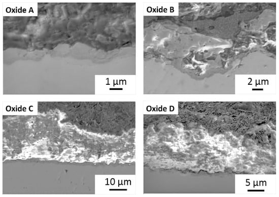Representative cross-sectional images of each oxide are provided in Figure 6, and the measured oxide cross-sectional thickness values are compiled in Figure 7. Oxide A showed a single layer oxide and Oxides B, C, and D were found to exhibit bi-layered oxides as shown in Figure 6 and Figure 7. The analyses of the inner and outer layer portions of the oxide thicknesses were evaluated separately, as compiled in Figure 7A,B. The total oxide thickness for each oxide group is compiled in Figure 7C. Interestingly, Oxides C and D revealed significantly thicker inner oxides of approximately 1.5 μm compared to 1.2 μm for oxide B (p < 0.01) and 1 μm for oxide A (p < 0.0001). Of the bi-layered oxides, oxide C revealed a significantly thicker outer layer of approximately 26 µm, compared to 14 µm for oxide D (p < 0.001) and approximately 4 µm for oxide B (p < 0.0001). Similarly, oxides C and D revealed significantly thicker total oxide thickness values of 27.6 µm and 15 µm compared to 5.5 µm for oxide B (p < 0.0001) and 1 um for oxide A (p < 0.0001).