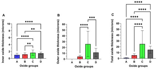 Representative oxide cross-sectional thickness values: (A) Inner layer oxide and (B) outer layer oxide. (C) Total oxide. Oxides C and D show significantly thicker inner oxide layers (1.5 µm) compared to Oxide A (p < 0.0001) and Oxide B (p < 0.01). Among the bi-layered oxides, oxide C has the thickest outer layer (26 µm), significantly greater than Oxide D (14 µm) (p < 0.001) and oxide B (4 µm) (p < 0.0001). Oxides C (27.6 µm) and D (15 µm) have the highest total oxide thickness, significantly greater than Oxide B (5.5 µm) (p < 0.0001) and Oxide A (1 µm) (p < 0.0001). The ** symbols denote a statistical significance of p < 0.01. the *** symbols denote a statistical significance of p < 0.001, and the **** symbols denote a statistical significance of p < 0.0001.