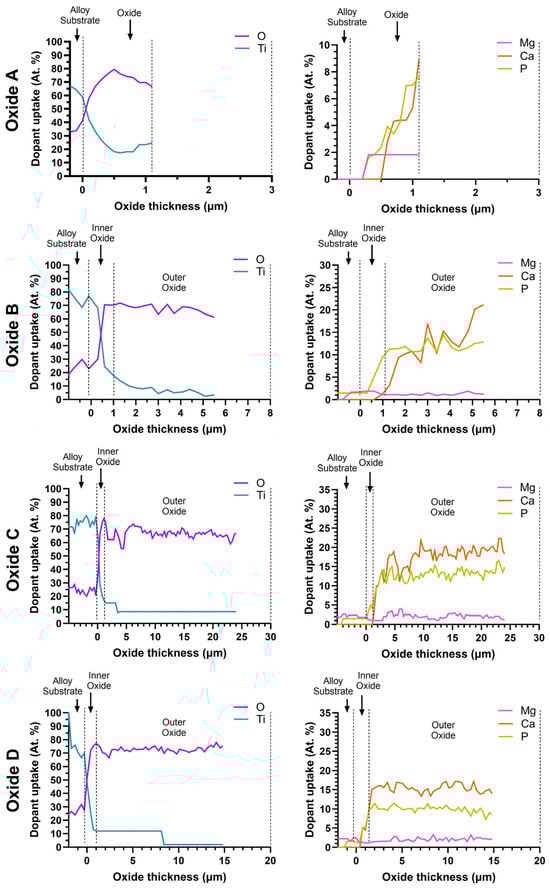 Representative EDS line scans of oxide dopant distributions across the layer cross-sections. The Ti and O element distributions are provided in the left column, and distributions of the Ca-, P-, and Mg-dopant elements incorporated from the anodization electrolyte are provided in the right column. The substrate interface is located on the left side of each window, followed by the inner and outer oxides moving left to right. Oxide A revealed a single layer oxide structure consisting of Ti, O, Ca, P, and Mg. Oxides B, C, and D revealed a bi-layered oxide structure, with the concentration of Ti decreasing from the substrate toward the outer oxide. Ca-, P-, and Mg-dopant uptake begins in the inner oxide layer and continues to increase before reaching a relatively stable level in the outer oxide for oxides B, C, and D. X-axis scales are adjusted to best represent the oxide thickness.