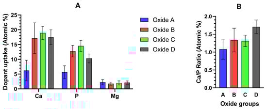 (A) EDS-derived Ca-, P-, and Mg-dopant uptake levels from the outermost 0.5 microns for oxide A and the outermost 2 microns of oxides B, C, and D. (B) Corresponding EDS Ca/P ratios within the outermost oxide surfaces. Ca/P surface ratios range from 1.1 to 1.7 for the oxides.