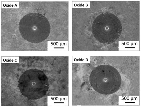 Representative VDI 3198 standard oxide layer adhesion results are compiled in Figure 10. The oxide adhesion results for oxide B revealed some microcracking and delamination. However, the oxide layer formed in oxides A, C, and D showed good adhesion to the titanium substrate with no evidence of delamination in either oxide, but mild microcracking was observed in oxides C and D.