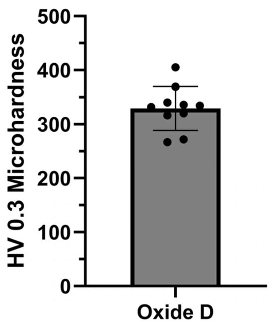 The Vicker’s microhardness dataset generated for oxide D is provided in Figure 11. The individual indentation values are included within the bar chart containing the average and standard deviation HV 0.3 values. The ten microhardness indentations exhibited HV 0.3 values of 329.2 ± 40.9.
