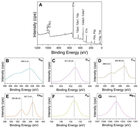Representative XPS spectra for oxide D. (A) survey full spectra, (B) Ti2p, (C) O1s, (D) C1s (E) Ca2p, (F) P2p, and (G) Mg1s.