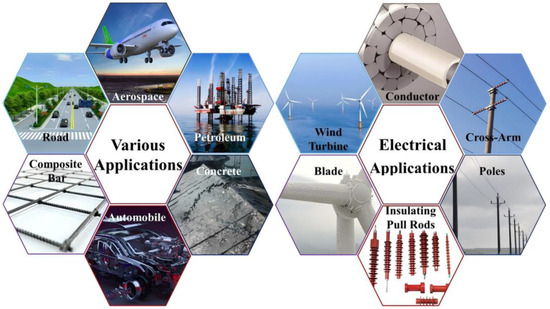 BF is a type of fiber with high strength, excellent modulus, high temperature resistance, cost-effectiveness, and non-toxicity [10]. It is natural, environmentally sustainable, easy to manufacture, and an effective green material for environmental protection [11]. Figure 1 shows that BF has been widely used in various industries. In the construction industry, BF has been utilized extensively as concrete reinforcement and external-wall insulation material, attributed to its high strength, corrosion resistance, and high-temperature stability. In the aerospace field, the high specific strength and modulus of BF make it an important component of light-weight composites. In the automobile industry, its application not only reduces the weight of the vehicle refining the fuel efficiency but also improves the impact resistance of the vehicle. In the energy sector, BF has been used to reinforce wind turbine blades, leading to a significant extension of their service life [9,12,13,14].