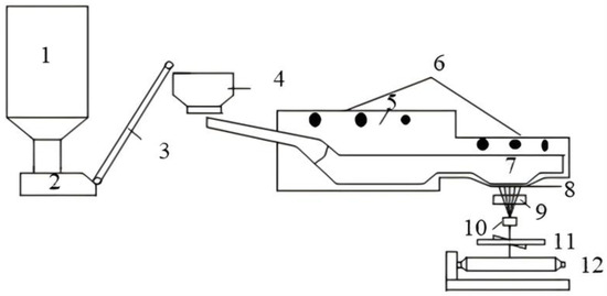 BF production process flow: 1—silo; 2—feeder; 3—lift conveyor; 4—quantitative feeder; 5—primary melting zone of raw materials; 6—gas nozzle; 7—secondary melting belt (front furnace); 8—platinum–rhodium alloy leakage plate; 9—application of infiltrating agent; 10—buncher; 11—fiber tensioner; 12—automatic winding machine.