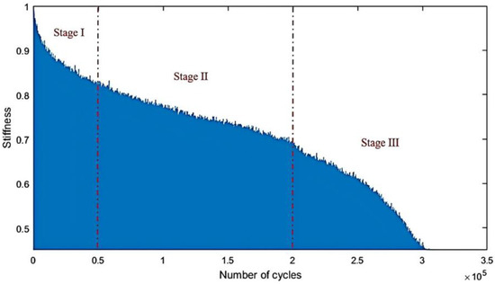 Three distinct stiffness reduction zones in the history of fatigue sample [50].