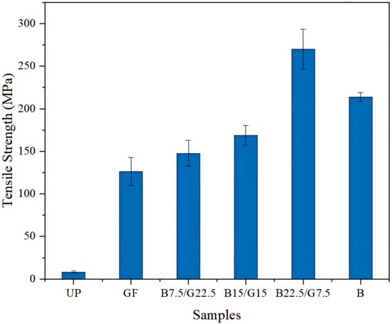 To prepare BF-reinforced UPR composites (BFRUPCs) with excellent mechanical properties, in the previous studies, researchers used a variety of fibers to reinforce BFRUPCs and determined the best raw-material ratio for BFRUPCs by comparing the performance differences among different BFRUPCs. Sapuan et al. [43] investigated the mechanical properties of longitudinal basalt/braided GF-reinforced UPR composites (GFRPCs). The results showed that the addition of BFs to GFRPCs could improve the density, tensile properties, and flexural properties. Figure 6 exhibits that the tensile strength of B22.5/G7.5 (the dosage of BF and GF was 7.5 and 22.5 wt.%, respectively) hybrid composites increased by 213.92 MPa compared with neat UP, which was 8.14 MPa. The study proved that the mechanical properties of blended-fiber-reinforced resin composites are superior to those of single-fiber-reinforced resin matrix composites. Prasath et al. [61] studied the effect of different stacking sequences of flax fiber (FF) and BFs on the low-velocity-impact and compression-after-impact responses of reinforced UPR composites. They found that the alternate arrangement of BFs and FF composites showed better performance in terms of low-velocity impact and compression. Manikandan et al. [62] studied the effects of BFs treated with and without acid–base treatment on the mechanical properties of BFRUPCs, including tensile, shear, and impact strengths. The results showed a change in the surface of the BFs treated with acid and alkali and an improvement in the adhesion of BFs and the matrix. Furthermore, it was found that the mechanical properties of BFRUPCs are better than those of GFRPCs. The study confirmed the applicability of BFs as a reinforcing agent in composites. Chairman et al. [39] found that the bending strength, interfacial bonding properties, and wear resistance of BFREPCs were superior to those of BF-reinforced polyester resin composite.