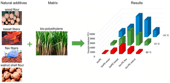 - Bazan, P.; Nosal, P.; Kozub, B.; Kuciel, S. Biobased Polyethylene Hybrid Composites with Natural Fiber: Mechanical, Thermal Properties, and Micromechanics. Materials 2020, 13, 2967. [Google Scholar] [CrossRef]