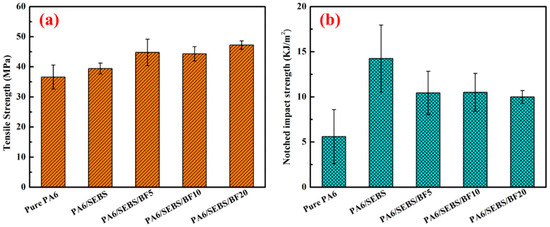Table 4 presents the data that highlight the differences in the mechanical properties of the resin matrix and the BFRRCs. After adding BFs, the tensile strength, flexural strength, bending strength, and impact strength of the resin matrix increased by 2626%, 804%, 70%, and 339.3% at the highest, respectively. BFs exhibited the best effect on improving the mechanical properties of unsaturated polyester resin (UPR), followed by epoxy (EP) resin, polyethylene (PE) resin, polypropylene (PP) resin, and polyamide (PA) resin. BF-reinforced resin matrix can significantly improve the mechanical properties of the resin matrix; therefore, BFRRCs are usually more likely to interest the manufacturers than resin.