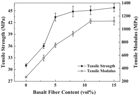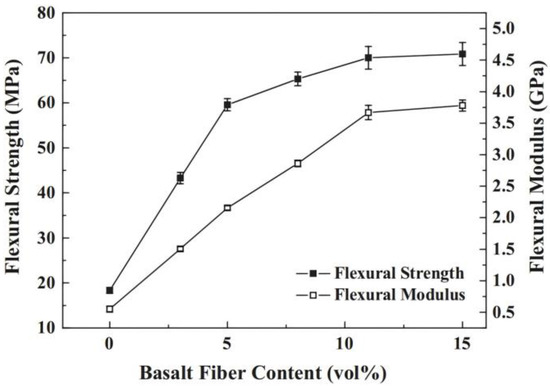 Basalt is a common igneous rock, formed when magma in the mantle is ejected to the surface by volcanic activity, which is followed by cooling and solidification [1,2]. Thus, it is a natural volcanic extrusive rock, and its main components are pyroxene, plagioclase, and olivine, with high iron and magnesium contents and a relatively low silicon content [3,4,5]. For centuries, natural stone basalt has been extensively used as a raw material for constructing houses, roads, river walls, and dams due to its high strength, durability, skid resistance, and drainage properties. About 100 years ago, the ground basalt raw material was melted at 1300 °C and then cast into bricks, slabs, and other building materials [6]. It was not until 1922 that Paul Dhe [7,8] first proposed and described the manufacturing technology of filament made of basalt in a patent. Since then, many patents on the production process and properties of basalt fiber (BF) have gradually been published. After 1960, BF became a major research target for military use in the United States and the former Soviet Union. By the 1970s, the research and development focus of American companies shifted to glass fiber (GF) and ceramic fiber, while the focus of the Soviet Union on BF remained high. In the late 1990s, the Soviet Union successfully developed a new-generation production process for BF, with significantly reduced energy consumption [9]. Nowadays, the research on BF, its production, and sales is mainly carried out in countries such as Russia, Ukraine, and China [6,7].