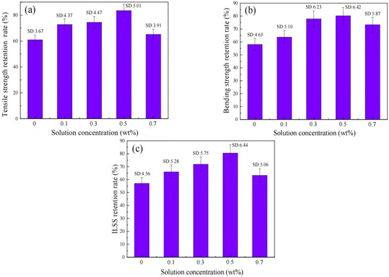 The main factors affecting the mechanical properties of BFREPCs are the strength of BFs, the mechanical properties of the EP resin, and the interfacial bonding strength of the BFs and EP resin. On the premise of determining the types of BFs and EP resin, the mechanical properties of BFREPCs can be significantly improved by increasing the interfacial bonding strength between the BFs and EP resin. To improve the interfacial bonding strength between the BFs and the EP resin matrix, Preda et al. [55] functionalized BFs by zinc oxide (ZnO) electroless deposition. They obtained a nanostructured interphase, which resulted in enhancement in the interfacial shear strength by 42%. Mittal et al. [20] coated graphene oxide (GO) on BFs through electrophoretic deposition (EPD), and modified BF (MBF) was further used to reinforce EP. The effects of MBF on the mechanical and tribological performance of BFREPCs were investigated. Results showed that the improved fiber–matrix bonding and uniform distribution of GO led to enhancement in the bonding of BFs to the EP resin matrix. The above-mentioned studies indicate that coating BFs by EPD is an effective method to improve the interfacial bonding strength between the BFs and the EP resin matrix. Moreover, the BFREPCs prepared with MBF show better tensile strength and less wear loss.
