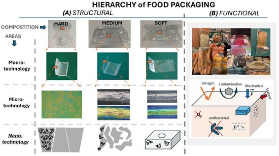 Similarly to how an architectonics tree provides connections to the construction of a building [1], Figure 1 shows a hierarchy of food packaging from structural (Figure 1A) and functional (Figure 1B) points of view. Looking at structural building blocks, food packaging can be split into nano-, micro-, and macro-scale structural blocks or areas. In these areas, nanoarchitectonics (at the bottom) determines properties of micro- and macro-building blocks. Looking at the structure of food packaging materials from the composition point of view, it can be noticed that molecules can be packed differently (denser or more disperse), which in turn affects the permeation of aqueous solutions and gasses, leading to harder or softer (images at the top of Figure 1A) packages. Digital microscopy images in Figure 1A depict micro-scale differences between different packages, which can be hard, medium, or soft at the macro-scale. As was reported earlier [1], construction at the nanoscale (nanoarchitectonics) does not always follow the initial design, while in the area of food packaging, this constraint is augmented by very different needs for packaging of different foods.