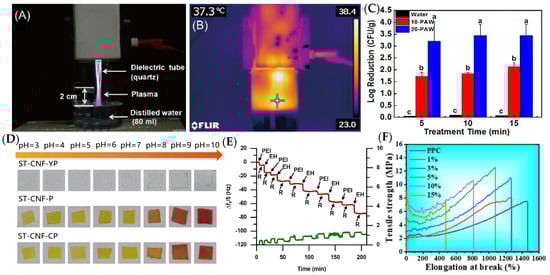 (A) A photograph of PAW generation. (B) The thermographic measurement of plasma near the water surface during PAW generation.z (C) PAW inactivation efficacy against S. aureus inoculated on strawberries with 4-day storage, columns with different letters indicate a significant difference (p < 0.05) (adapted from [132] with permission from Elsevier). (D) Images of colorimetric response of curcumin solution and films in buffers with different pH values: films for monitoring pork freshness (adapted from [119] with permission from Elsevier). (E) Changes in oscillating frequency (red or blue line, left axis), from the 5th overtone from the QCM-D measurements, and energy dissipation (green line, right axis) as a function of time, recorded during the deposition of five bilayers for the PEI/EH system at pH 8 (adapted from [108]). (F) Longitudinal tensile strength of film (adapted from [134] with permission from Elsevier).