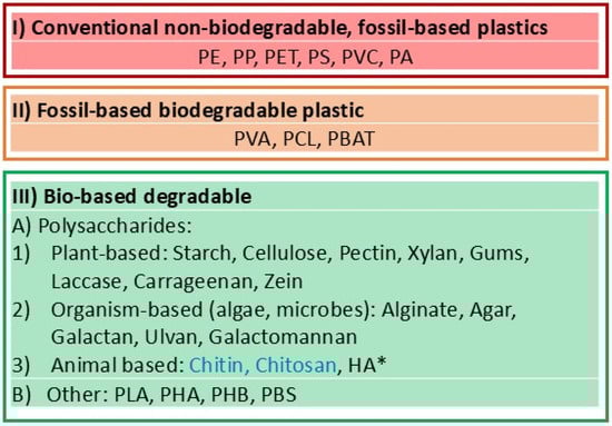 Classification of plastic- and biopolymer-based materials used for packaging. (I) Polyethylene (PE), polypropylene (PP), polyethylene terephthalate (PET), polystyrene (PS), and polyvinyl chloride (PVC). (II) Polybutylene succinate (PBS), polyvinyl alcohol (PVA), polycaprolactone (PCL), and polybutylene adipate co-terephthalate (PBAT). (III) Polylactic acid (PLA), polyhydroxyalkanoates (PHA), polyhydroxybutyrate (PHB), and hyaluronic acid (HA). *—can also be synthesized in laboratory conditions.