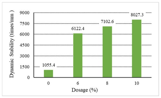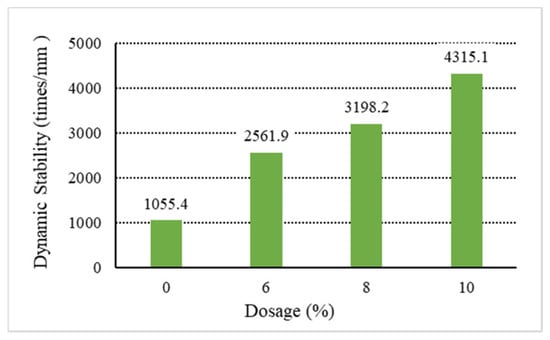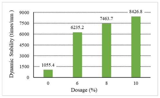 It can be seen that the Marshall stability of the asphalt mixture shows an upward trend with the increase in the dosage of various modifiers. At the exact dosage, directly added waste plastics C, D, E, and fast-melting dispersant Y can significantly improve the Marshall stability of the asphalt mixture compared to the general waste plastic B. This shows that the directly added waste plastic asphalt modifier can dramatically enhance the mixture’s high-temperature performance. At the same time, the general waste plastics at a 6% dosage can also initially meet the requirements of rutting-resistant agents in the Marshall stability (greater than or equal to 10 kN). The details of the rutting experiments results are shown in