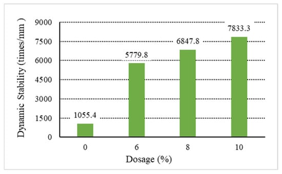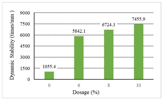 Figure 5, the exact dosage, without directly added technology-processed waste plastic B affecting the high-temperature performance of the mix, has a specific improvement effect at a dosage of 10% on its dynamic stability to meet the rutting agent in the hot summer area (dynamic stability greater than 4200 times/mm). In contrast, the waste plastics processed by directly added technology and the fast-melting dispersant can meet the code’s requirements in all hot summer areas. At 6%, the dynamic stability is more than 4800 times/mm, and at 10%, the dynamic stability is more than 7000 times/mm. From the point of view of the quick-melting dispersant, the quick-melting dispersant itself is the addition of high-fluidity polyethylene, which can significantly improve the high-temperature performance of the asphalt mixture. The dynamic stability can reach more than 7400 times/mm when the dosage is 10%. From a general point of view, the anti-rutting performance of the asphalt mixture is slightly lower than that of the product after mixing the quick-melting dispersant with general waste plastics and quick-melting dispersant. The 4/6 mixing ratio of the two is the best, and then, with the increase in the quick-melting dispersant, the high-temperature modification effect is reduced. However, if the ratio of the two is too small, such as 1/9 or 2/8, it cannot meet the needs of dry mix dispersibility in directly added technology.