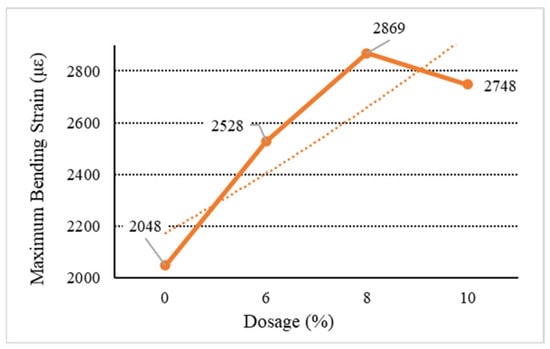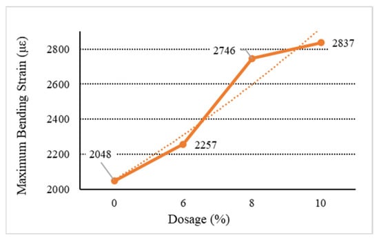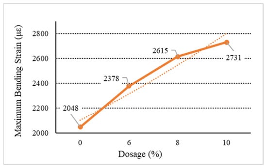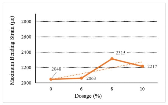 Figure 6, as the dosage increases, the maximum bending strain increases from 2048 µε at 0% dosage to 2217 µε at 10% dosage. This indicates a gradual improvement in flexibility as the dosage increases, suggesting that the base asphalt becomes more flexible with higher additive content. In
