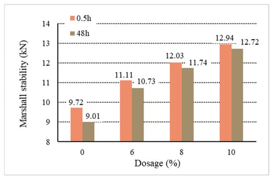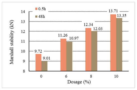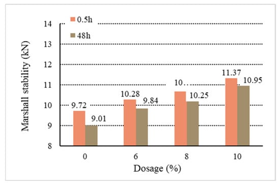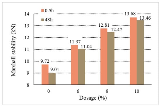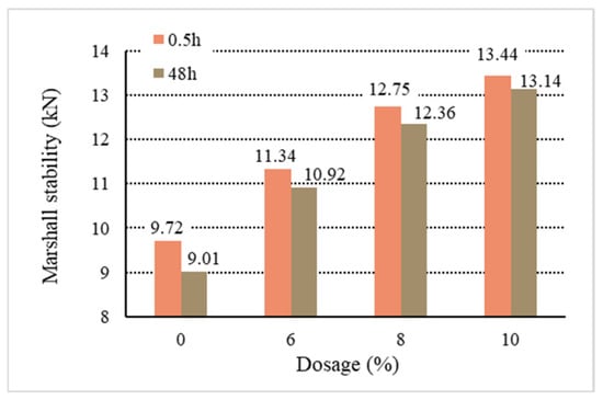 The test method was as follows: The first group of specimens was immersed in a water bath at a constant temperature of 60 °C for half an hour, after which its Marshall stability and flow values were tested, and subsequently, the second group of specimens was immersed in a water bath at the same temperature for two days, after which its Marshall stability was tested. Finally, the residual stability was calculated based on the ratio of the Marshall stability of the latter to that of the former. The experimental data are shown in