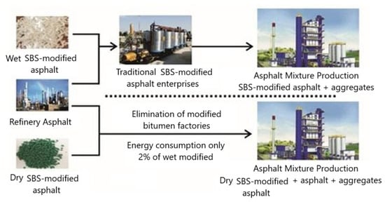 12]. Despite this, waste plastics are far cheaper than traditional modifiers such as SBS (styrene/butadiene/styrene block copolymer), making them an attractive option for combining with other materials, such as waste rubber powder, styrene–butadiene latex, and SBS, to improve low-temperature performance while keeping costs low [