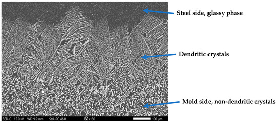 Apart from the copper disc mold simulator, a lab-scale mold simulator is another tool for understanding heat transfer during steel casting, particularly concerning the evolution of the flux film between the mold and cast steel. The literature offers a broad range of research on mold simulators [16,17,18,19,20,21,22,23,24,25,26], covering topics such as mold flux crystallization, heat transfer through mold flux, lubrication of mold flux, and interfacial thermal resistances in continuous casting of various steel grades. Recently, Nazim et al. [27] have implemented a novel approach to an optical fiber-instrumented mold simulator that can be further used to enhance the understanding of heat transfer through mold flux. According to the study, high-resolution optical fiber-based distributed temperature sensors can capture transient heat transfer phenomena. Figure 2 shows a micrograph of the mold flux film’s cross-section recovered from a mold simulator experiment. The flux film contains two component layers: a crystallite layer, which forms from the devitrification of the glassy layer and is non-dendritic in appearance, and a dendritic layer that grows against the heat transfer and is close to the steel side. These dendrites may nucleate heterogeneously from the pre-existing non-dendritic crystals, as supported by a previous study [28]. The key challenge lies in determining the testing methodology that best represents this environment and whether nucleation in the system is primarily heterogeneous or homogeneous. Another important consideration is the nature of this environment, and whether the mold wall contributes to wetting for nucleation, though the exact answer remains unclear.