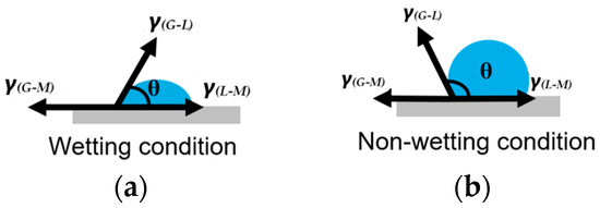 Schematics of (a) wetting and (b) non-wetting conditions of mold flux in contact with mold wall.