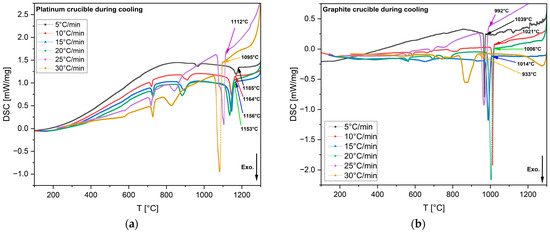 In the DSC, changes in heat flow or calorific values were measured across various temperatures. During fusion or crystallization, the DSC curve showed an exothermic peak, indicating the release of excess heat during crystallization. This process decreased the system’s entropy, driving it to a lower energy state. Figure 5 presents the heat flow versus temperature curves from non-isothermal DSC tests performed on 60 mg mold flux specimens at various cooling rates (5, 10, 15, 20, 25, and 30 °C/min) using platinum and graphite crucibles. Crystallization temperatures were determined by the onset of exothermic peaks (shown in a downward direction in Figure 5) during cooling.